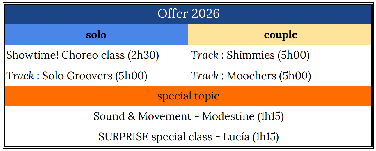 You can top up this track with special classes on Friday or Sunday, or even combine it with the solo track “Solo Groovers” or the couple track “The Moochers”.